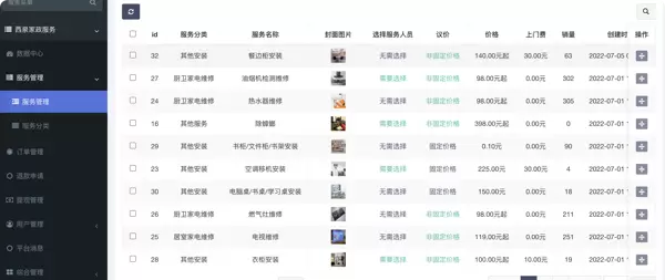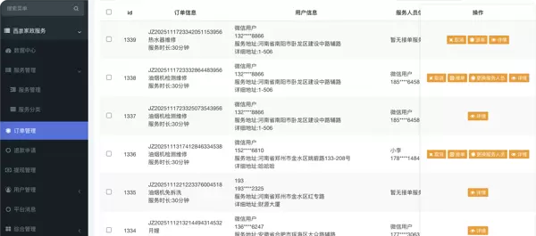 支持对所有服务项目进行分类管理、上下架操作及首页推荐权重调整。全部订单信息集中展示,包含服务类型、用户资料、指派人员等,便于统一调度与异常处理。