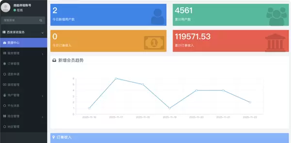 首页集成今日新增用户数、当日订单收入、累计用户总量、历史总收入等核心指标,并通过折线图动态展示会员增长趋势与营收变化,辅助科学决策。