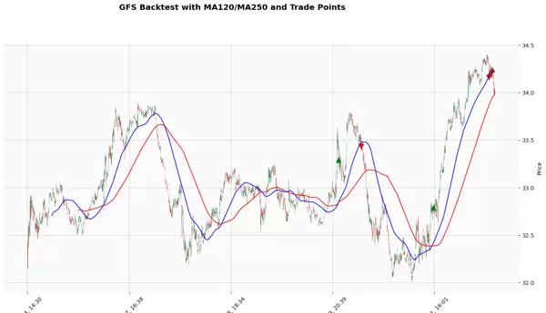 我下载了 GFS 从 2025-11-14 到 2025-11-21 的 1 分钟级别数据,用于计算 120 周期与 250 周期的移动平均线。策略的买入信号设定为:两条均线均呈现上升趋势,且短期均线(120)位于长期均线(250)之上;卖出信号则为价格回落至 120 均线时触发。