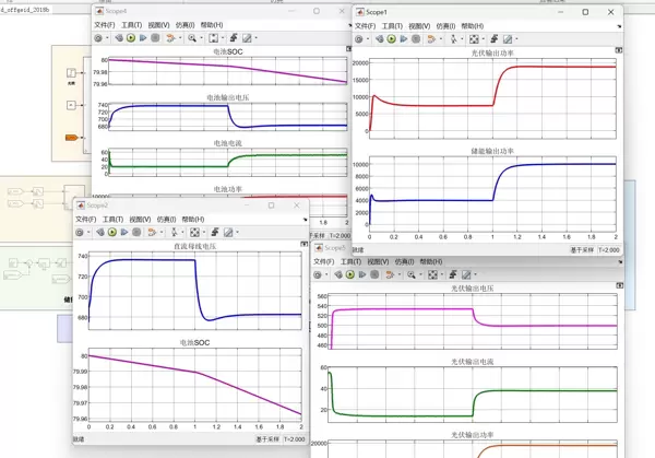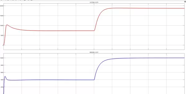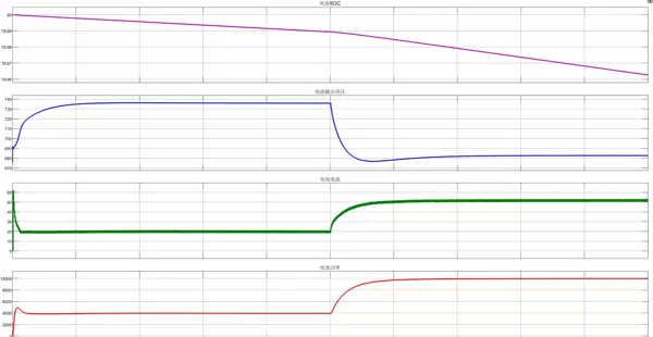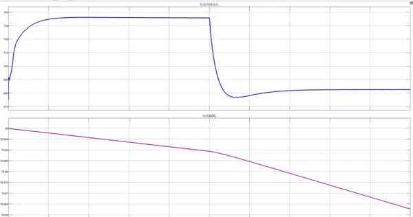 在并网模式下,光伏保持最大功率输出。当t=1s时突加负载,储能系统立即响应,释放能量以补偿功率缺额,维持母线电压基本稳定。观察电压曲线可见,电压瞬时跌落被控制在695V以上,表明电流内环具备良好的快速响应能力,响应时间需低于2ms才能有效抑制扰动。