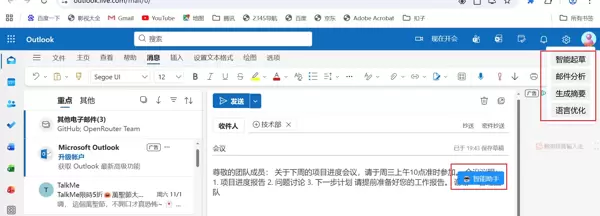 - 智能起草:通过指令生成完整邮件,涵盖会议邀请、客户感谢、工作汇报等12类常见场景。