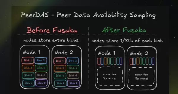 PeerDAS 是 Fusaka 硬分叉的 “核心亮点” 升级。它允许节点仅存储每个 Blob 的部分数据,而非完整 Blob。具体来说,节点现在只需存储 Blob 数据的 1/8,这意味着在不提升节点硬件配置要求的前提下,Blob 数据存储空间可直接提升 8 倍。