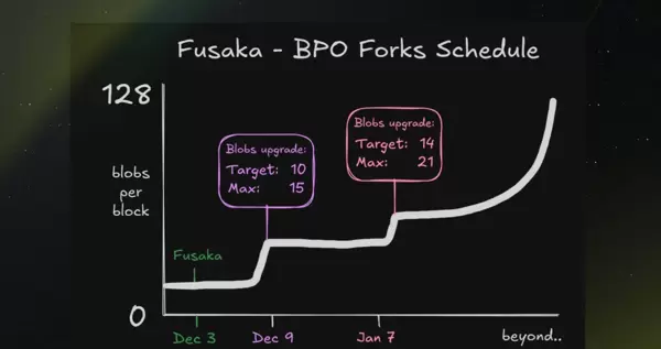 EIP-7892(“BPO 分叉”)为以太坊引入了新机制:无需通过硬分叉即可直接提升每区块 Blob 的目标容量。该提案还配套了一套 “扩容时间表”:在 Fusaka 硬分叉启动后不久,以太坊将分多次提升每区块 Blob 容量,最终目标是将容量提升至 128 个 / 区块(较当前目标提升 20 倍以上)。