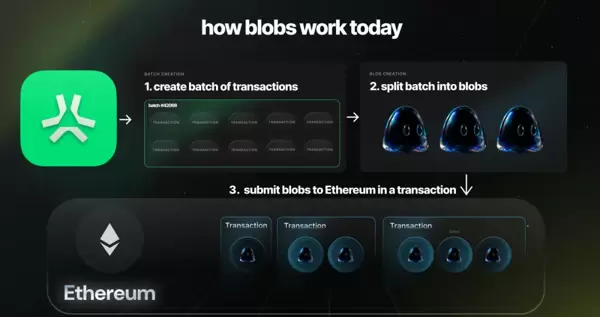 如果你对 Blob 还有疑问,以下内容将为你快速解答。像 Abstract 这样的 Layer 2 Rollup 网络会将数千笔交易打包成一个批次,并通过一种名为 “Blob” 的特殊数据类型上传至以太坊主网(L1),从而继承其安全性。整个过程可以分为三个步骤: