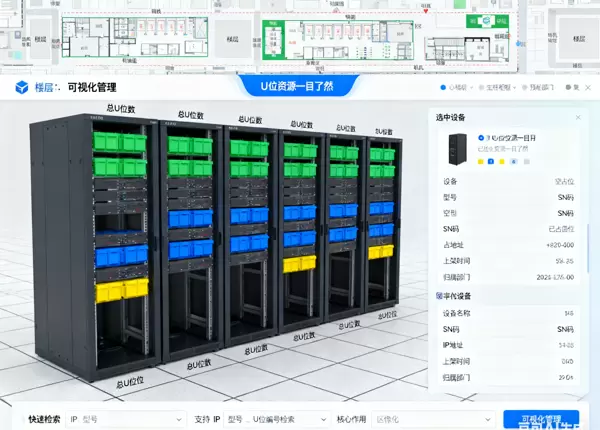 借助RFID标签、智能传感器等物联网技术,系统为每个U位赋予唯一数字标识,并通过2D/3D可视化界面展示全机房U位状态(空闲、占用、预留),实现设备信息与实际位置的精确绑定。