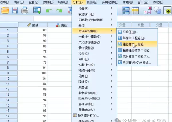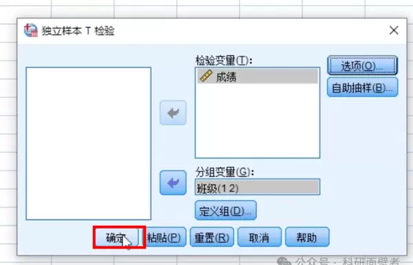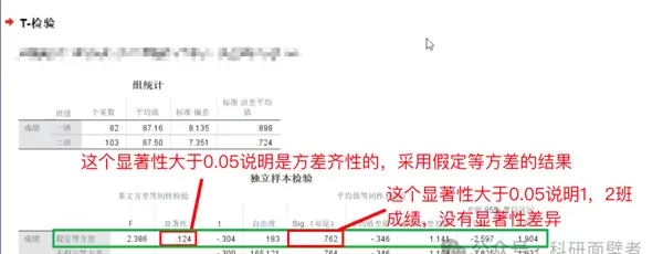 在“独立样本检验”表格中,包含两行结果:“假定等方差”和“不假定等方差”。首先需查看方差齐性检验的显著性(p值),结果显示为大于0.05,因此未拒绝方差齐性的原假设,应参考“假定等方差”这一行的结果。