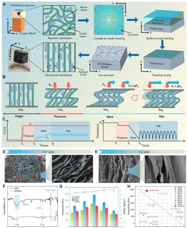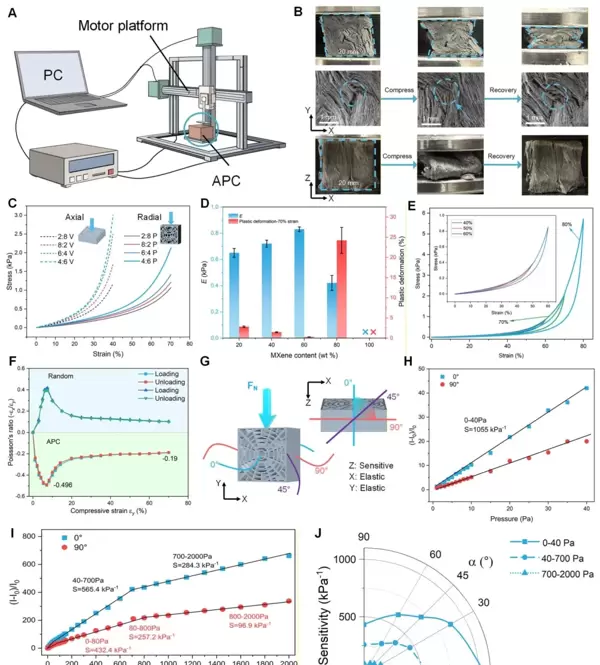所设计的人工帕西尼小体(APC)采用TOCN-MXene气凝胶材料,模仿天然PC的层状微观结构。该结构赋予器件独特的力学各向异性:轴向具有较高的刚度(在40%应变下应力达3.005 kPa),而径向则表现出良好的弹性(70%应变下应力为2.127 kPa)。其轴向弹性模量为1.59 kPa,径向为0.83 kPa,塑性变形仅为0.27%,确保在承受切向力时可实现可逆形变。