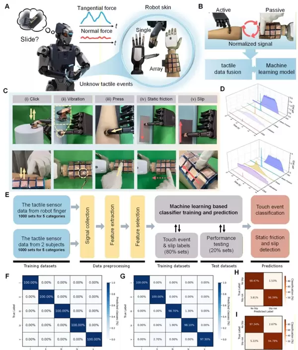 E)数据处理与机器学习流程图,涵盖触觉事件分类、静摩擦与动态滑移识别的算法实现路径。