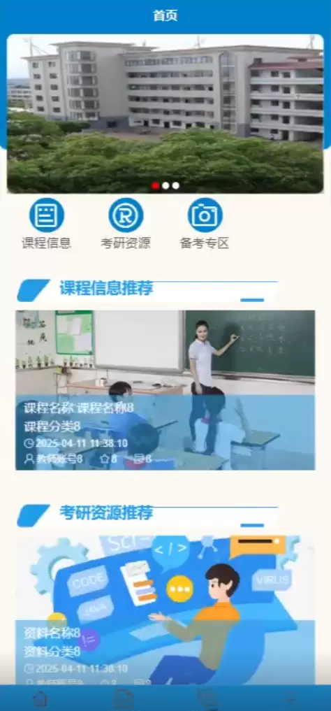 - 核心功能入口:固定设置“课程信息”“考研资源”“备考专区”三个主要导航按钮,方便用户快速进入目标模块。