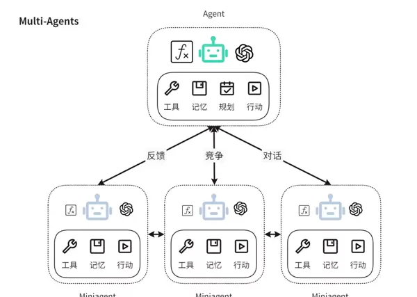 3 级(协作式多智能体架构):模拟人类组织结构,设立协调代理负责任务分发,多个专业化子代理协同完成高复杂度目标。