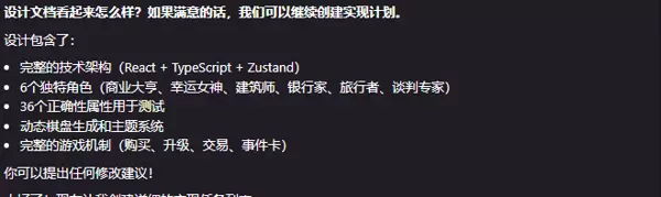 “我想做一个网页版大富翁,包含自定义角色能力、60 张事件卡、可变主题的动态棋盘、支持玩家间交易,并具备游戏进度保存功能。”