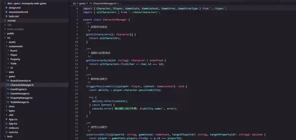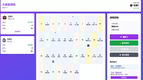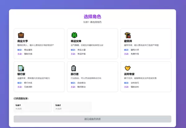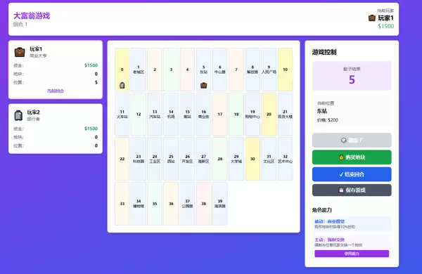最终成果是一款基于 React + TypeScript + Zustand + Vite 的网页版大富翁游戏。该项目不仅功能完整,还集成了角色技能系统、60 张事件卡机制、动态棋盘、玩家交易体系以及多主题切换等复杂特性——这些通常需要大量人工设计与编码实现。