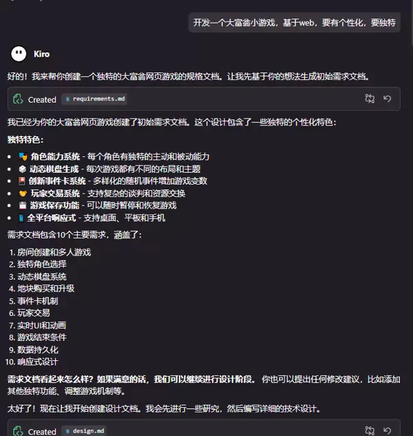 换句话说:原本需要两天才能完成的需求文档,Kiro 在十分钟内就完成了。这使得项目迅速进入实质开发阶段。