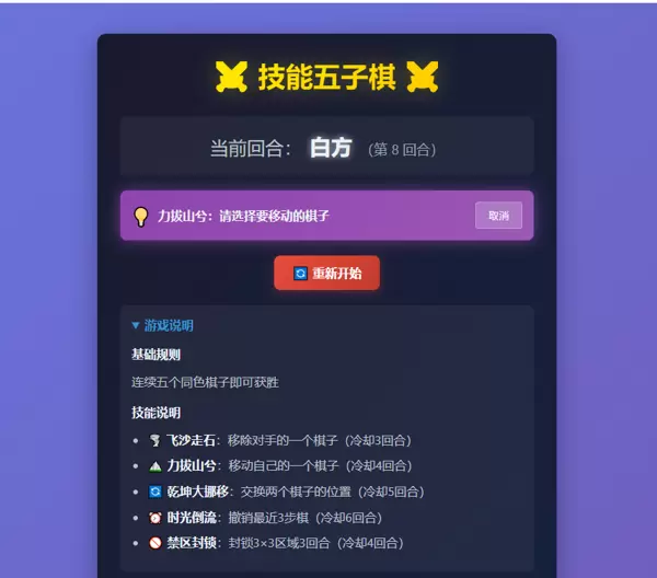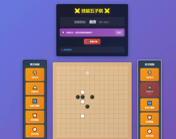 为了验证Kiro在真实项目中的能力,我决定开发一款名为“技能五子棋”的游戏应用。该游戏在传统五子棋规则基础上,引入了五种独特的主动技能机制,既保留了经典玩法的策略深度,又增加了对抗的趣味性和不确定性。