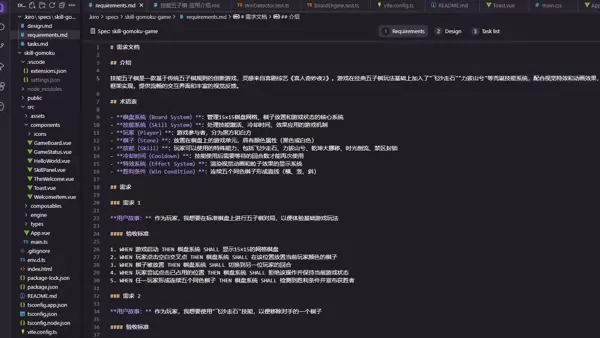 项目启动之初,我的想法还比较抽象:“想做一个带技能系统的五子棋”。得益于Kiro内置的需求引导系统,我得以逐步将这个模糊构想转化为具体、可执行的功能列表。