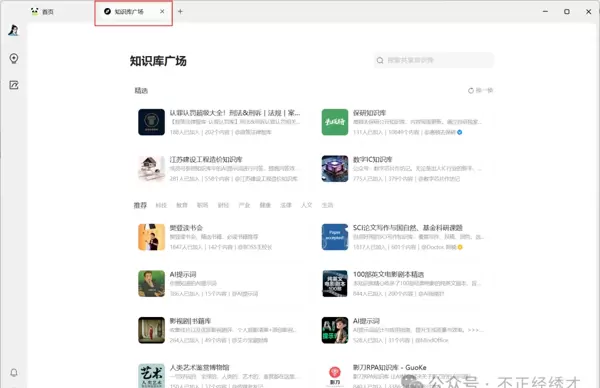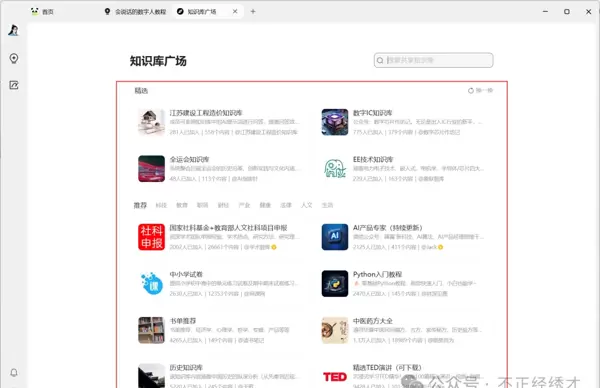 - 浏览知识库广场,发现大量公开共享的知识资源,涵盖多个领域;