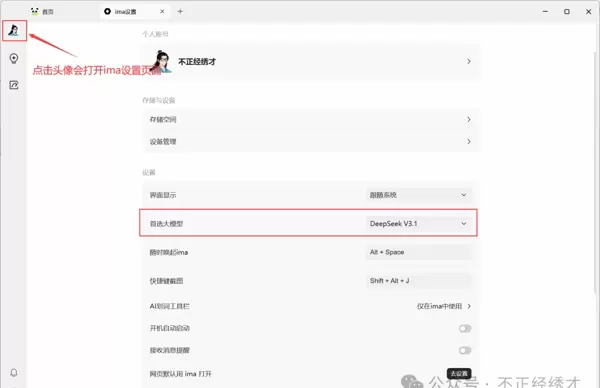 点击左上角人物头像可进入设置页面。该页面整体配置较为简洁,建议根据偏好选择默认使用的大型语言模型。每位用户默认享有30GB存储空间;若同时使用电脑端与手机端,还可额外获得20GB奖励空间。其余设置保持默认即可满足日常需求。