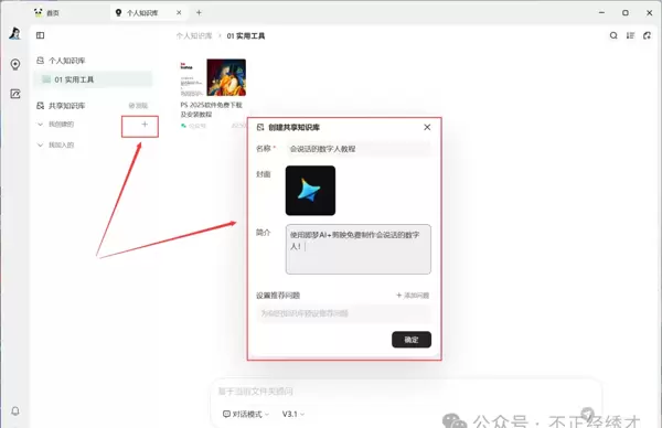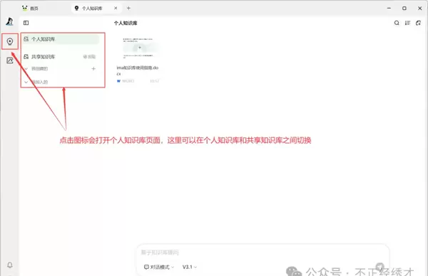 - 点击头像下方第一个图标,进入知识库管理界面,区分显示“个人知识库”与“共享知识库”;