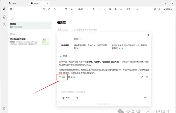 (3)提问后,系统会自动生成符合 Markdown 语法的文章内容,点击“插入”即可将该内容添加至当前笔记中;