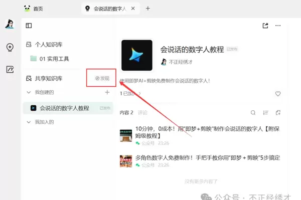 ① 知识库广场:提供一个浏览和发现他人共享知识库的平台页面,便于资源交流与学习参考;