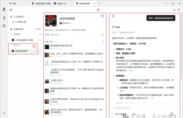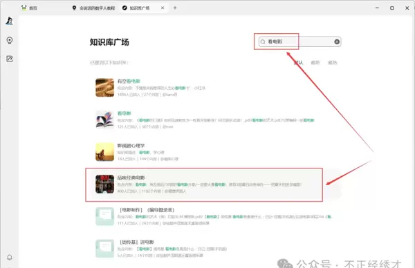 - 例如,以“看电影”为关键词搜索,筛选人气高、内容丰富的知识库;