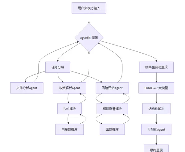 | 风险评估Agent | 根据用户行为及相关材料,调用知识图谱进行违规路径分析,识别潜在风险点。 | 独立运行,但其输入通常依赖于用户操作及其他Agent的输出结果。 |