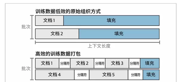 然而,随着模型规模不断扩展,尤其是在处理长上下文场景时,传统绝对位置编码暴露出效率问题。例如,在训练阶段,若将仅有10个词的短句放入长达4K token的上下文窗口中,会造成大量空间浪费。为提升资源利用率,实践中常将多个较短文档打包至同一个上下文批次中进行联合训练:
