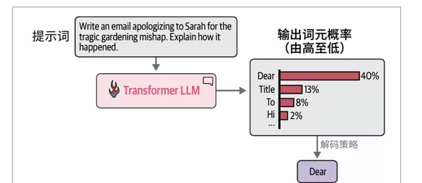 更灵活的方式是引入随机性,依据各个词元的概率进行采样。例如,若“Dear”作为下一词元的概率为 40%,则它有 40% 的机会被选中,而非绝对优先。这种方式允许次高概率词元也有机会参与生成,提升文本多样性。