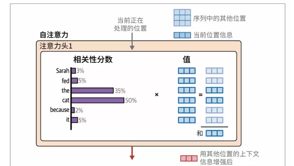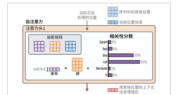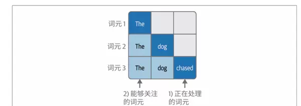 - 计算当前待处理词元(如图中粉色箭头指示)与之前所有输入词元之间的相关性得分;
