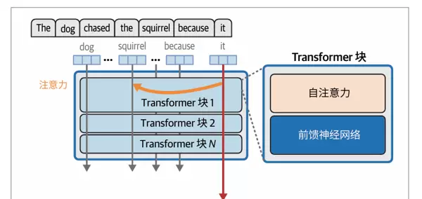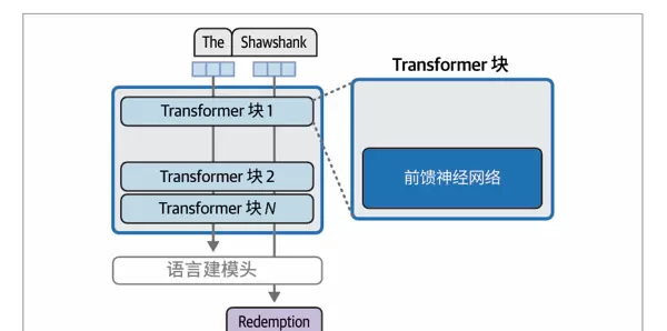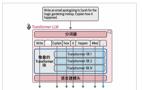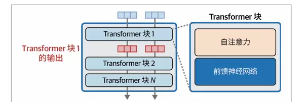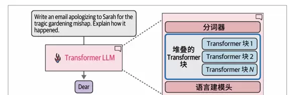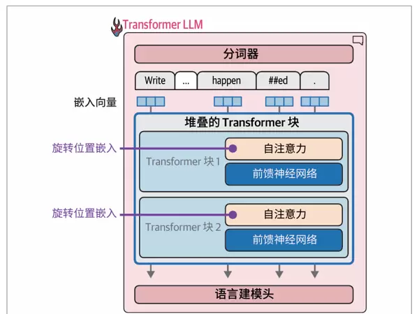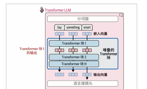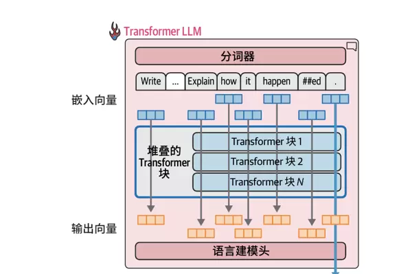 大型语言模型(LLM)中的 Transformer 架构由多个连续堆叠的 Transformer 块构成。原始论文中使用了约6个这样的块,而现代多数 LLM 则包含超过100个。每个块依次处理输入数据,并将其输出传递给下一个块,形成逐层抽象的信息流动。