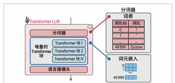 分词器负责将原始文本切分为模型可识别的词元,并映射为高维向量(即词元嵌入)。常见的词表规模可达数万个词元,每个都被赋予唯一的嵌入表示。
