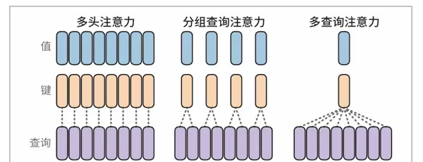 - 多查询注意力:所有头共享同一组键和值矩阵,仅保留各自的查询矩阵,提升了推理速度。