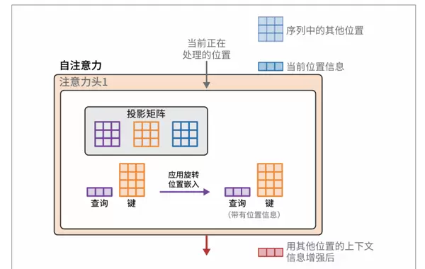 具体而言,在计算注意力分数之前,位置信息会被分别注入到查询(Query)矩阵和键(Key)矩阵中。这种融合发生在点积运算之前,确保了位置感知能力能有效影响后续的相关性评分过程: