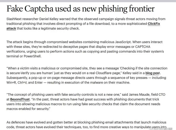 已有案例显示,攻击者曾伪造“身份验证”页面诱导用户输入账号密码或启用宏功能,但尚未有系统性报道将其作为剪贴板劫持的入口。本文所述攻击正是在此背景下演化而来,利用用户对验证流程的盲信,实现更高阶的欺骗。