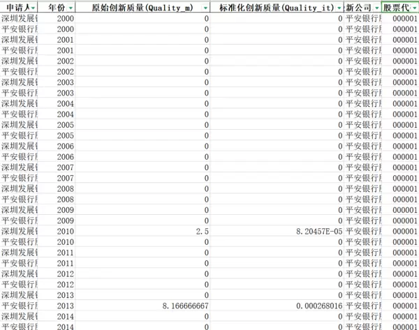 本数据主要基于国家知识产权局官方网站的专利申请信息提取,涵盖以下核心字段:申请人信息、申请年份、原始创新质量(Quality_m)、标准化后的创新质量(Quality_it)、公司最新名称及对应股票代码。
