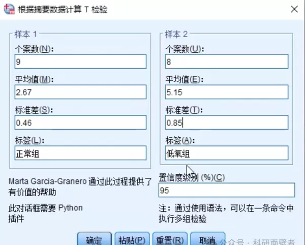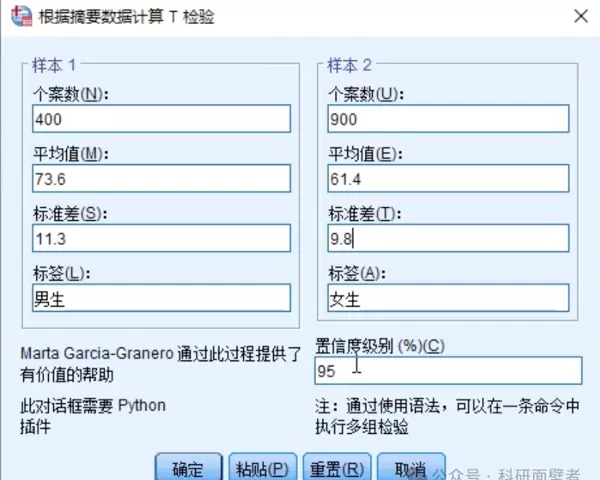 然而,在实际研究过程中,有时无法获取原始数据,仅掌握部分统计信息,例如样本量、均值和标准差。此时,仍需判断两组之间的差异是否具有统计学意义。这种情况下,可以采用“摘要独立样本T检验”(Summary Independent Samples t-test)来进行分析。