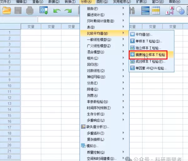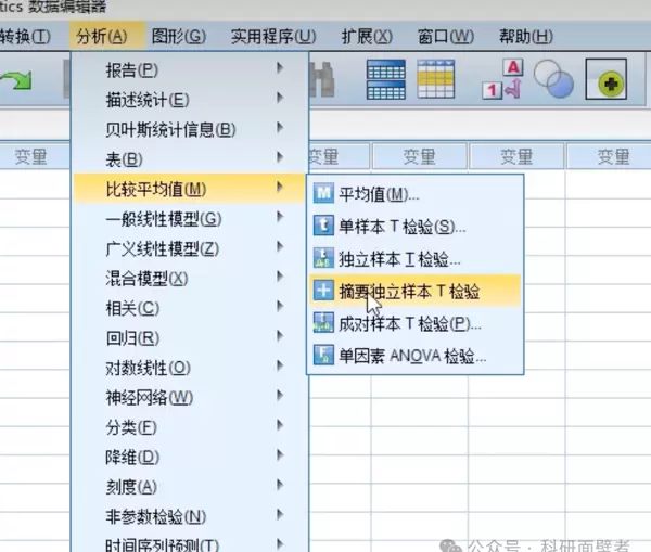 当缺乏原始数据,仅有样本量、均值和标准差时,摘要独立样本T检验是一种有效的分析手段。现代SPSS版本已提供图形化界面支持该功能,极大提升了分析效率与可操作性。