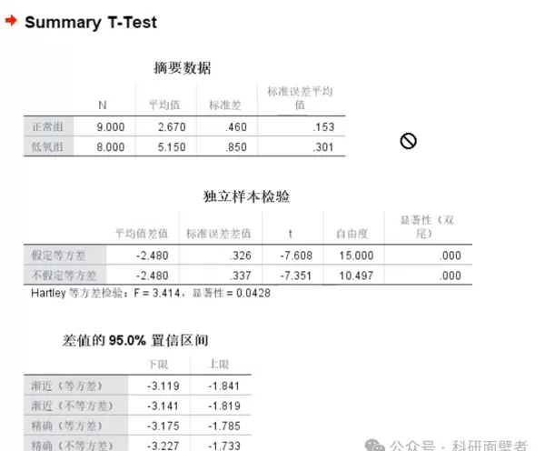 结果显示,无论假设方差是否相等,对应的显著性水平(p值)均小于0.05,表明正常组与低氧组在心肌血流量上存在显著差异。