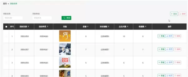 在贷款信息管理界面,管理员可通过输入贷款名称或类别实现快速检索。查询结果以表格形式展示,支持新增、删除等操作。点击任一记录可跳转至详情页,查看完整的贷款信息,并具备编辑权限,能够及时修正数据内容。对于已下架或失效的贷款项目,管理员可执行删除操作,确保系统信息的时效性与整洁度。