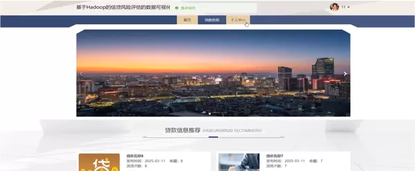 管理员主界面作为系统的控制中枢,集成多个功能模块,包括系统首页、个人中心、用户管理、风控专员管理、贷款信息、贷款申请、信用评估、信贷数据管理以及轮播图配置等。界面布局清晰、模块划分明确,便于管理员高效完成各项运维任务。