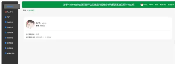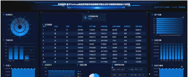 本课题聚焦于构建一个基于大数据架构的信贷风险评估数据可视化分析与预测平台。系统采用 Java 语言进行开发,融合 Spring Boot 框架实现后端服务的高效构建,利用 Hadoop 技术处理海量信贷数据,并通过 MySQL 数据库存储结构化信息,形成稳定可靠的技术架构体系。