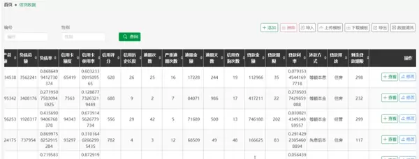 进入信贷数据模块后,管理员可根据编号或性别等条件进行筛选查询。系统支持多种数据操作方式,如新增录入、批量导入、模板下载与上传、数据导出等功能,满足大规模数据处理需求。同时提供数据清洗工具,用于提升数据质量。点击具体条目后,可查看客户的详细信贷记录,包括基本信息、贷款金额、还款状态等内容,并支持修改更新,保障数据的准确与一致。