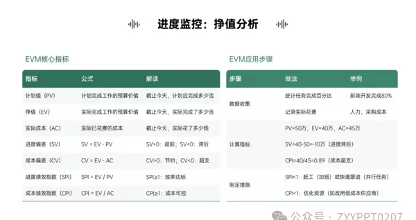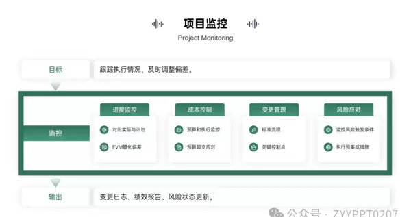 目标:实时监督项目执行情况,对比实际表现与基准计划,必要时进行纠偏,确保目标达成。