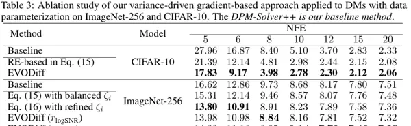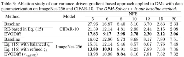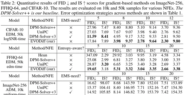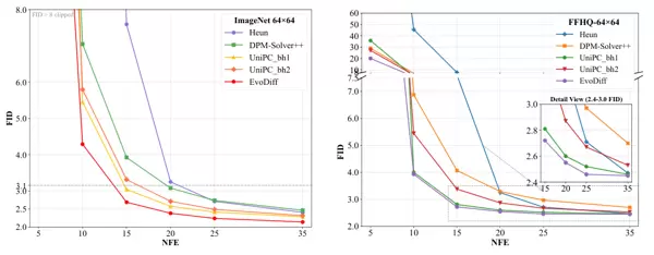 在多个标准数据集上的广泛实验验证了其卓越性能。EVODiff 在 CIFAR-10、ImageNet 和 LSUN-Bedrooms 等基准上,与 DPM-Solver++、UniPC、DEIS 等当前先进算法进行了全面对比。