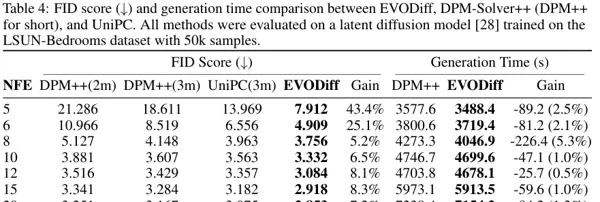 在 LSUN-Bedrooms 数据集上,5 NFE 条件下,EVODiff 的 FID 达到 7.912,远优于 UniPC 的 13.969,性能提升高达 43.4%。同时,由于避免了冗余计算,EVODiff 在生成时间上也具备优势——在保证最高生成质量的同时,速度比 UniPC 快约 5.3%。