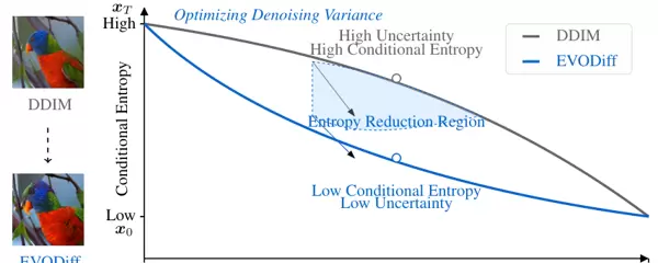 EVODiff 正是为填补这一理论空白而生。研究团队引入信息论视角,将整个逆向生成过程视为条件熵动态演化的路径。前向扩散不断添加噪声、破坏结构、提升熵值;相应地,逆向推断必须实现熵减,即持续降低中间状态的不确定性。