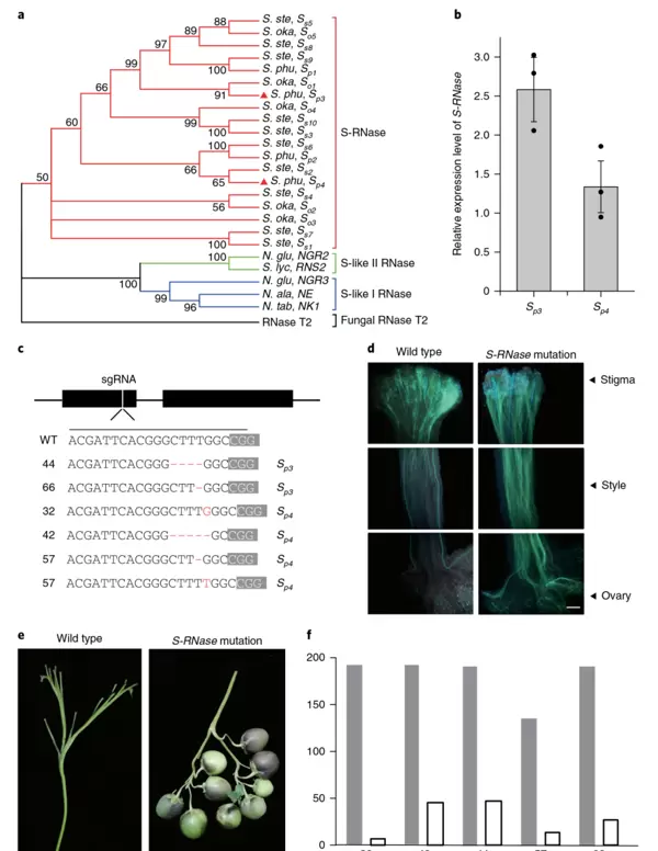 图4 敲除 S-RNase 基因克服马铃薯自交不亲和性(Ye et al., 2018)。 (a)不同 S-RNase 基因的进化关系分析; (b)在二倍体马铃薯S15-65材料花柱中两个 S-RNase 等位基因的表达水平; (c)S-RNase 基因结构及编辑植株中的突变类型; (d, e)通过苯胺蓝染色观察野生型与敲除植株自交授粉后花粉管生长情况及坐果表现; (f)T0代自交产生的T1代植株中 Cas9 基因分离情况检测,灰色表示检测总数,白色代表不含 Cas9 的植株(Cas9-free)。结果显示:野生型植株花柱中花粉管生长受阻,停滞于花柱上半部,无法结实;而敲除植株中花粉管可顺利延伸至胚珠,并形成饱满果实。同时,T1代检测证实 S-RNase 突变可稳定遗传,并能获得无外源基因残留的Cas9-free个体。