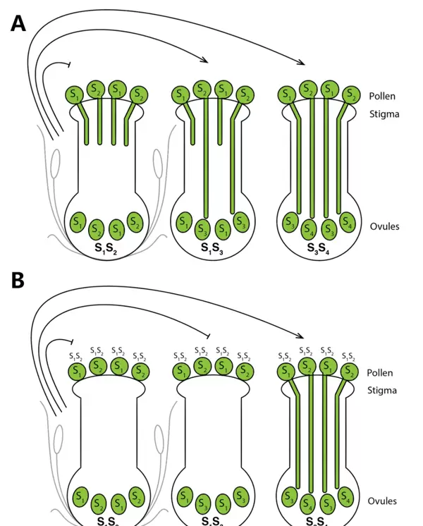 在同型自交不亲和系统中,主要分为配子体自交不亲和(Gametophytic self-incompatibility, GSI)和孢子体自交不亲和(Sporophytic self-incompatibility, SSI),二者在识别机制与反应位点上存在显著差异。