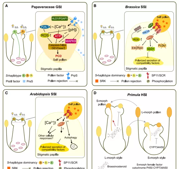 此外,还存在异型自交不亲和系统(HSI),典型代表为报春花科植物。这类系统依赖于花部结构的空间分离,其花柱长度多态性与SI特性紧密连锁。CYP734A50作为关键调控基因,通过降低油菜素内酯水平抑制细胞伸长,促成短花柱形态的形成,进而影响授粉结果(见图2D)。
