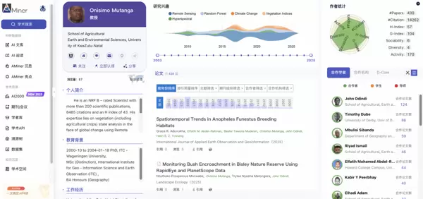 Onisimo Mutanga 同样是期刊的核心高产作者,共发表论文3篇,被引用24次。其研究重点集中在遥感技术在农业与生态监测中的应用,围绕精准农业、植被动态变化、土地退化评估等方向持续产出成果。他所发表的论文《Assessing Drivers of Vegetation Fire Occurrence in Zimbabwe - Insights from Maxent Modelling and Historical Data Analysis》(可通过AMiner检索: